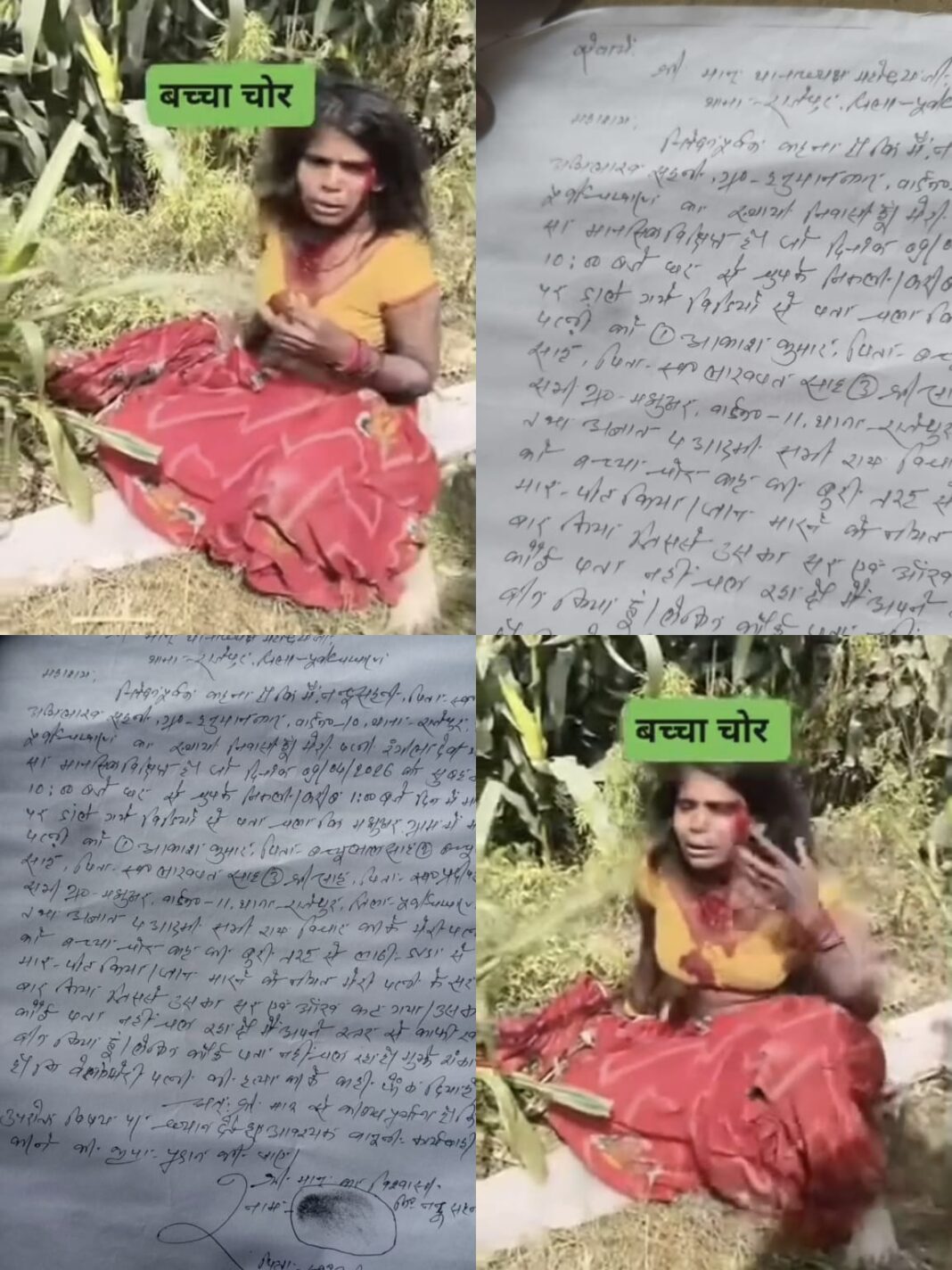 पीड़ित पति ने बताया कि वह वार्ड नंबर 10 का स्थायी निवासी है। उसकी पत्नी रंगालादेवी लंबे समय से मानसिक रूप से अस्वस्थ रहती है। 1 मई 2026 की सुबह करीब 10 बजे वह घर से चुपके से निकल गई थी। दोपहर करीब 1 बजे गांव के आसपास के लोगों ने उसे देखा, जिसके बाद कुछ लोगों ने उसे बच्चा चोर समझ लिया। आरोप है कि आकाश कुमार समेत कई लोगों ने मिलकर महिला को घेर लिया और लाठी-डंडों से बेरहमी से पीटना शुरू कर दिया।