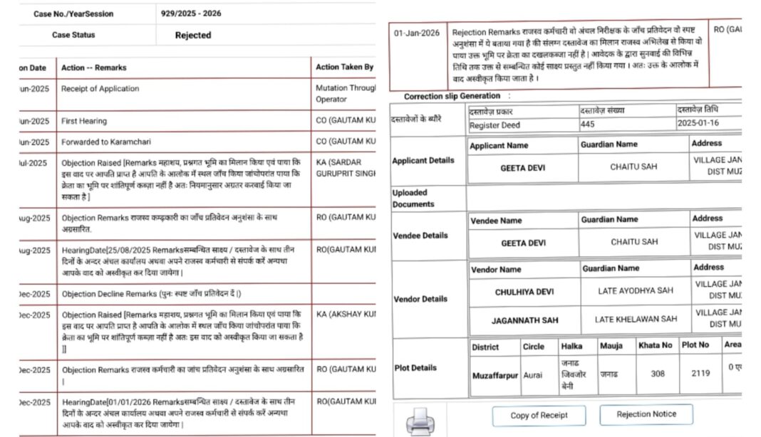मुजफ्फरपुर। औराई अंचल के जनाढ़ गांव से एक ऐसा मामला सामने आया है, जिसने जमीन खरीदने वाले लोगों की चिंता बढ़ा दी है। यहां गीता देवी द्वारा जमीन खरीदने के बाद दाखिल किया गया म्यूटेशन वाद आखिरकार प्रशासन ने खारिज कर दिया। जानकारी के अनुसार, गीता देवी ने 16 जनवरी 2025 को दस्तावेज संख्या 445 के तहत जमीन की रजिस्ट्री कराई थी। इसके बाद म्यूटेशन के लिए आवेदन दिया गया। 20 जून 2025 को आवेदन प्राप्त होते ही उसी दिन पहली सुनवाई हुई और मामला जांच के लिए राजस्व कर्मचारी को भेज दिया गया। 31 जुलाई 2025 को जांच के दौरान पहली आपत्ति सामने आई। जांच रिपोर्ट में बताया गया कि संबंधित भूमि पर पहले से विवाद है और खरीदार का उस पर शांतिपूर्ण कब्जा नहीं है। इसके बाद आवेदक को कई बार साक्ष्य प्रस्तुत करने का मौका दिया गया, लेकिन कोई ठोस दस्तावेज पेश नहीं किया गया। 22 अगस्त 2025 को जांच रिपोर्ट अनुशंसा के साथ आगे बढ़ाई गई और 25 अगस्त को सुनवाई तय हुई। प्रशासन ने स्पष्ट निर्देश दिया कि तीन दिनों के भीतर जरूरी दस्तावेज प्रस्तुत किए जाएं, अन्यथा वाद खारिज कर दिया जाएगा। इसके बावजूद कोई प्रमाण प्रस्तुत नहीं किया गया। 20 दिसंबर 2025 को फिर से आपत्ति दर्ज की गई और दोबारा जांच में भी यही सामने आया कि जमीन पर खरीदार का कब्जा नहीं है और दस्तावेज राजस्व अभिलेखों से मेल नहीं खाते। 29 दिसंबर 2025 को अंतिम रिपोर्ट अग्रसारित की गई और 1 जनवरी 2026 को अंतिम सुनवाई हुई। इस दौरान भी आवेदक कोई संतोषजनक साक्ष्य पेश नहीं कर सकी। अंततः अंचल अधिकारी गौतम कुमार ने 1 जनवरी 2026 को वाद खारिज करते हुए स्पष्ट कहा कि राजस्व कर्मचारी और अंचल निरीक्षक की संयुक्त जांच में खरीदार का जमीन पर दखल कब्जा नहीं पाया गया। साथ ही बार-बार अवसर देने के बावजूद कोई प्रमाण प्रस्तुत नहीं किया गया। क्या है पूरा मामला केस संख्या 929/2025-26 में गीता देवी द्वारा दाखिल म्यूटेशन आवेदन को जांच और सुनवाई के बाद अस्वीकृत किया गया। यह भूमि जनाढ़ मौजा, खाता संख्या 308, प्लॉट संख्या 2119 से संबंधित है। प्रशासन के अनुसार, केवल रजिस्ट्री कराना पर्याप्त नहीं होता, बल्कि जमीन पर वास्तविक कब्जा और वैध दस्तावेज होना भी जरूरी है। इस फैसले के बाद क्षेत्र में चर्चा तेज है और लोग अब जमीन खरीदने से पहले पूरी जांच-पड़ताल करने की बात कह रहे हैं।