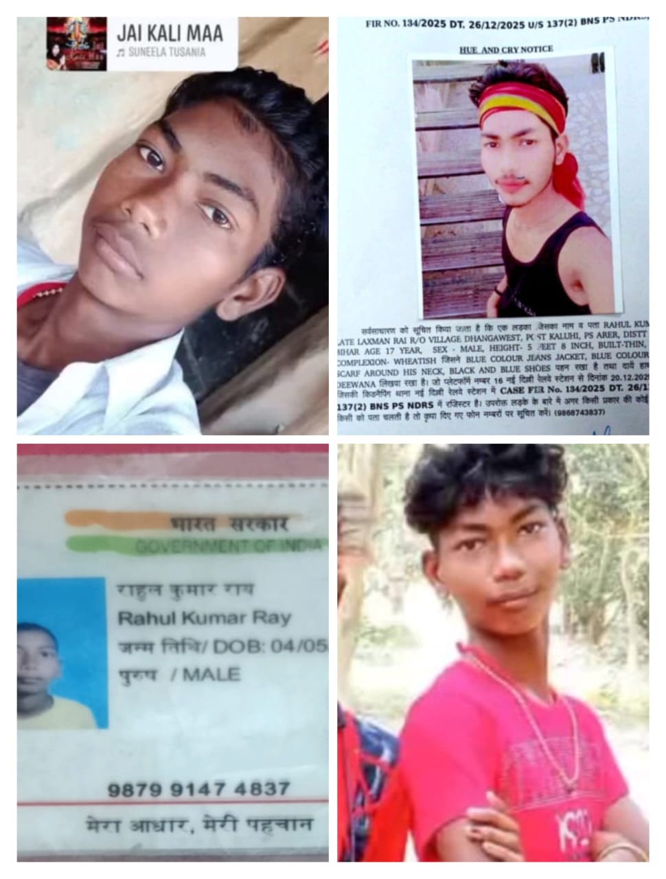 परिजनों के अनुसार, राहुल ग्राम ढंगावेस्ट, पोस्ट कलुही, थाना अरैर, जिला मधुबनी (बिहार) का रहने वाला है। वह 18 दिसंबर को अपने गांव के लड़कों रमन यादव और बैजू यादव के साथ काम के लिए गया था। 20 दिसंबर को ठंड अधिक होने के कारण उसने काम करने से मना कर दिया और घर लौटने की बात कही। इसके बाद दोनों लड़कों ने उसे बिहार जाने के लिए टिकट दिलवाया और करीब सुबह 11:15 बजे नई दिल्ली रेलवे स्टेशन के प्लेटफॉर्म नंबर 16 पर छोड़ दिया। इसके बाद से उसका कोई पता नहीं है। उसका मोबाइल नंबर 8084191767 भी लगातार बंद आ रहा है।