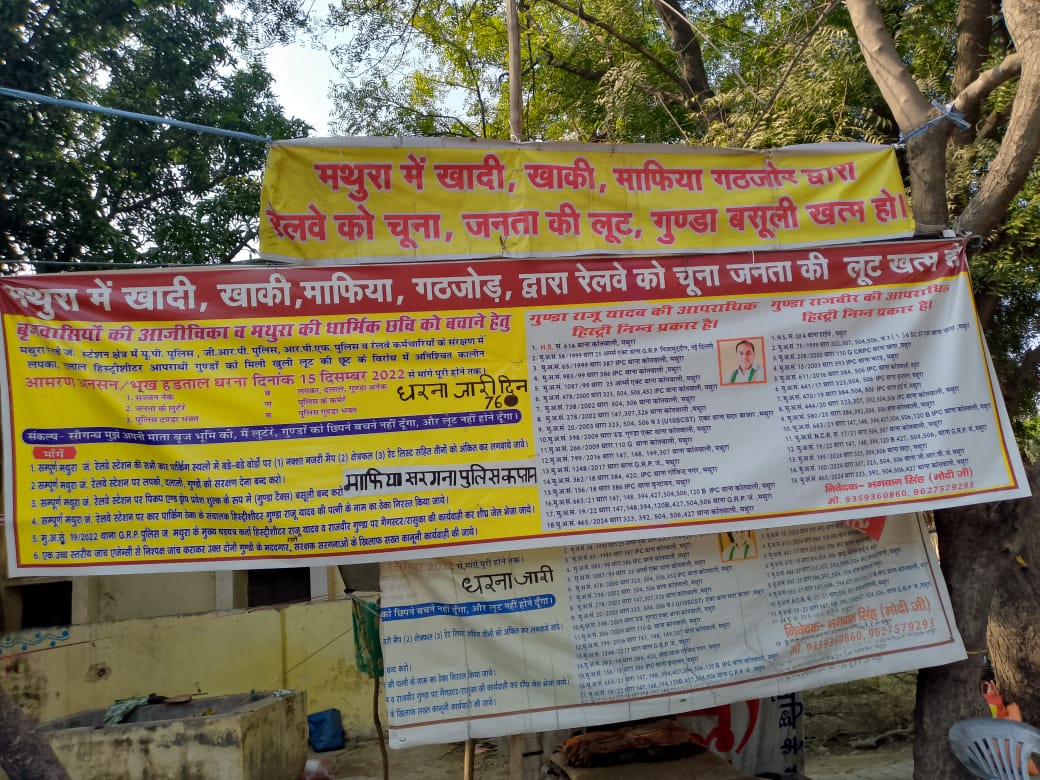 भगवान सिंह का कहना है कि उन्होंने 28 दिसंबर 2022 से मथुरा कचहरी परिसर में एसएसपी आवास के पास वट वृक्ष के नीचे परिवार सहित अनिश्चितकालीन सत्याग्रह शुरू किया था। उनका आरोप है कि मथुरा जंक्शन रेलवे स्टेशन क्षेत्र में कथित रूप से गुंडा टैक्स और अवैध वसूली का नेटवर्क चलाया जा रहा है, जिसमें कुछ प्रभावशाली लोगों का संरक्षण भी शामिल है। इस संबंध में उन्होंने कई बार प्रशासनिक अधिकारियों से लेकर उच्च पुलिस अधिकारियों तक शिकायतें दीं और जांच भी कराई गई, लेकिन कार्रवाई नहीं हुई।