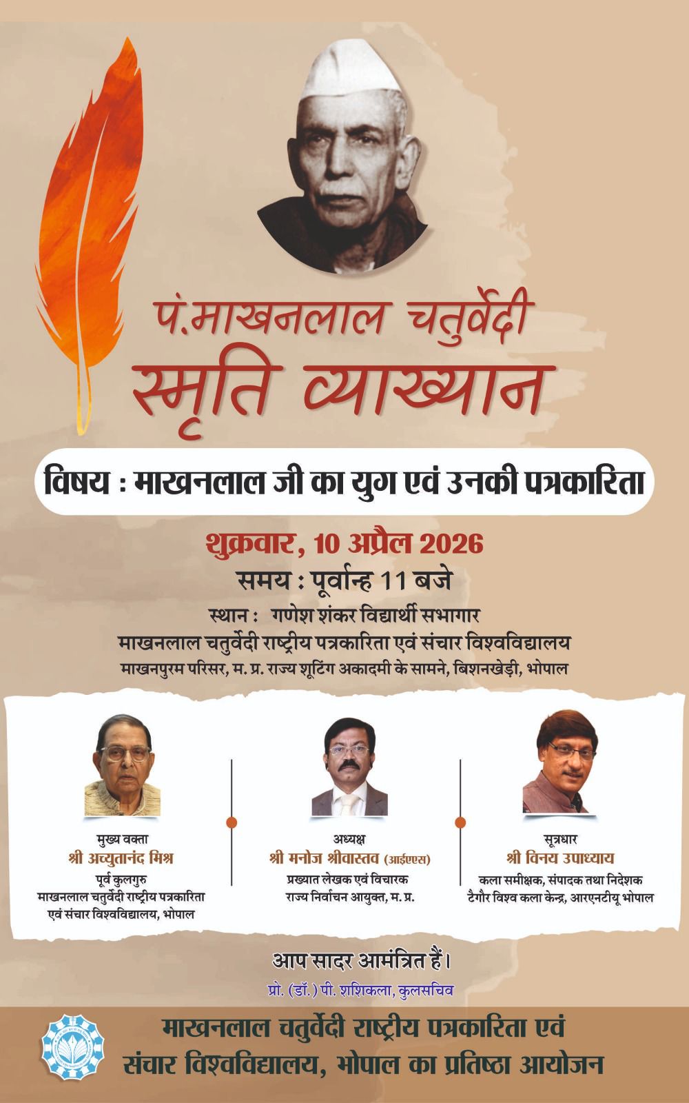 भोपाल। राजधानी भोपाल में पत्रकारिता और साहित्य के क्षेत्र में एक महत्वपूर्ण आयोजन होने जा रहा है। पं. माखनलाल चतुर्वेदी की स्मृति में आयोजित विशेष व्याख्यान कार्यक्रम 10 अप्रैल 2026, शुक्रवार को आयोजित किया जाएगा। इस प्रतिष्ठित आयोजन में देश के वरिष्ठ पत्रकार, शिक्षाविद् और विचारक एक मंच पर जुटेंगे, जहां माखनलाल जी के युग और उनकी पत्रकारिता पर गहन चर्चा होगी।