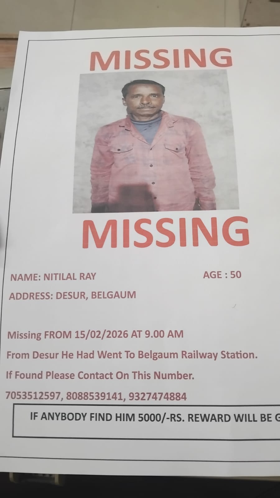 परिजनों ने आम जनता से भावुक अपील की है कि यदि किसी को नितिलाल राय के बारे में कोई भी सूचना मिले तो तुरंत नीचे दिए गए नंबरों पर संपर्क करें। जानकारी देने वाले को 5000 रुपये का इनाम देने की घोषणा की गई है।