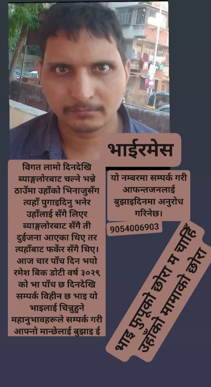 बताया जा रहा है कि रमेश मूल रूप से नेपाल सेककर निगर पालिका वांडर्सन जिला डोटी का रहने वाला है और पिछले दो-तीन वर्षों से मुंबई के झुकी थाना क्षेत्र में काम कर रहा था। वह अपने भिनाजे के साथ बेंगलुरु आया था, लेकिन लौटने के बाद से संपर्क पूरी तरह टूट गया। सबसे चिंताजनक बात यह है कि रमेश ने अपना मोबाइल फोन भी अपने बड़े भाई के घर छोड़ दिया था, जिससे उसकी लोकेशन ट्रेस करना बेहद मुश्किल हो गया है।