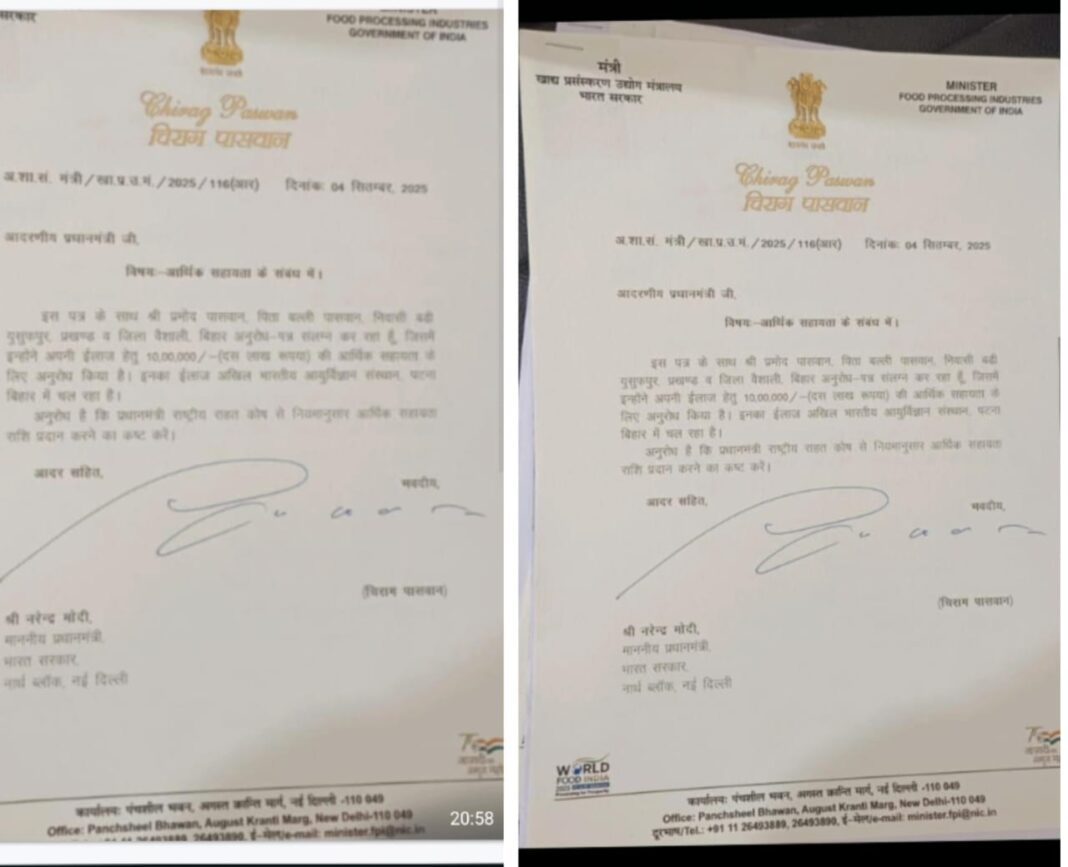 देश की राजधानी में शुक्रवार को एक मार्मिक मामला सामने आया जब केंद्रीय खाद्य प्रसंस्करण उद्योग मंत्री चिराग पासवान ने गंभीर रूप से बीमार वैशाली निवासी प्रमोद पासवान की आर्थिक सहायता के लिए प्रधानमंत्री नरेंद्र मोदी को विशेष पत्र भेजा। पत्र में मरीज के इलाज हेतु दस लाख रुपये की सहायता तत्काल उपलब्ध कराने की सिफारिश की गई है।